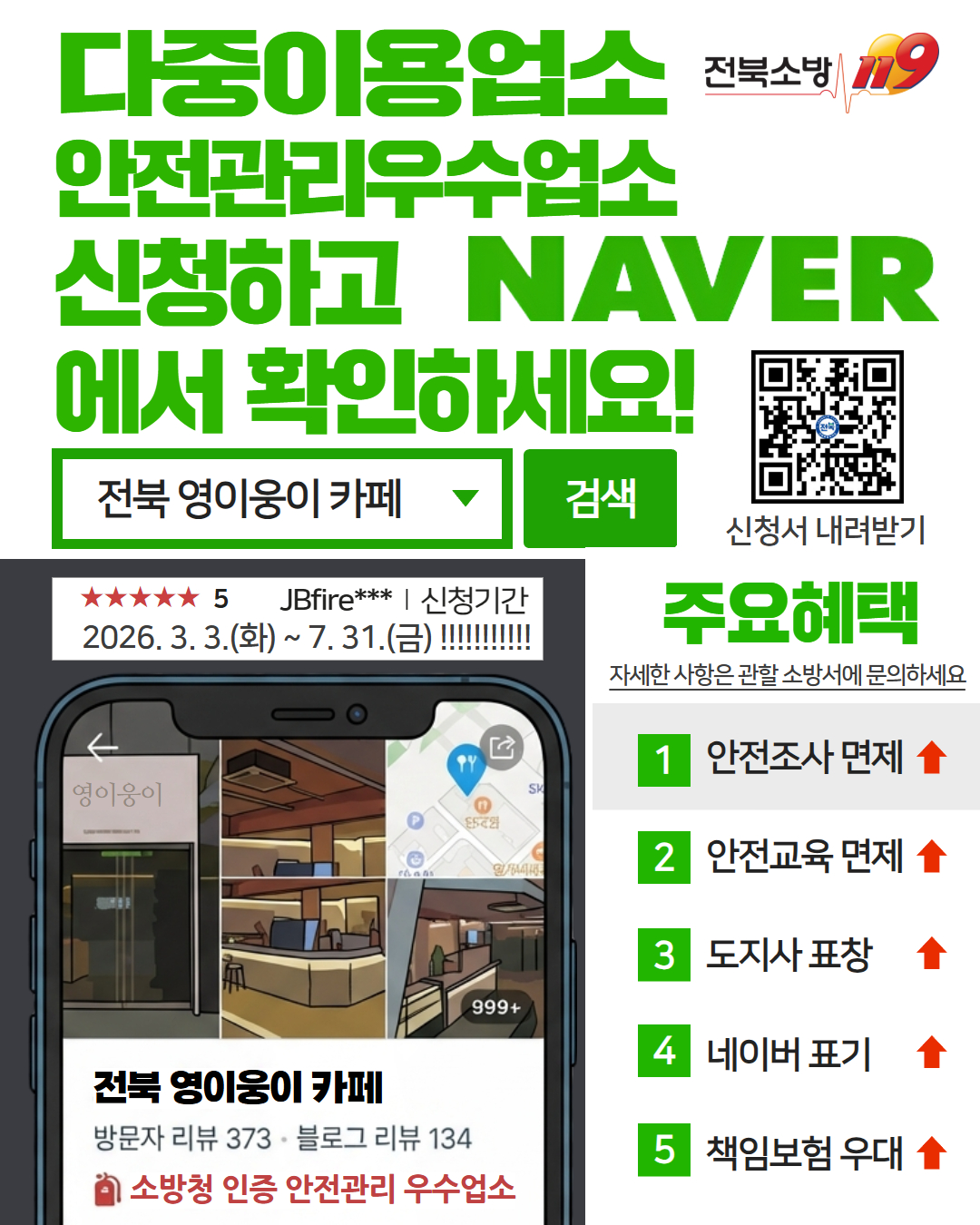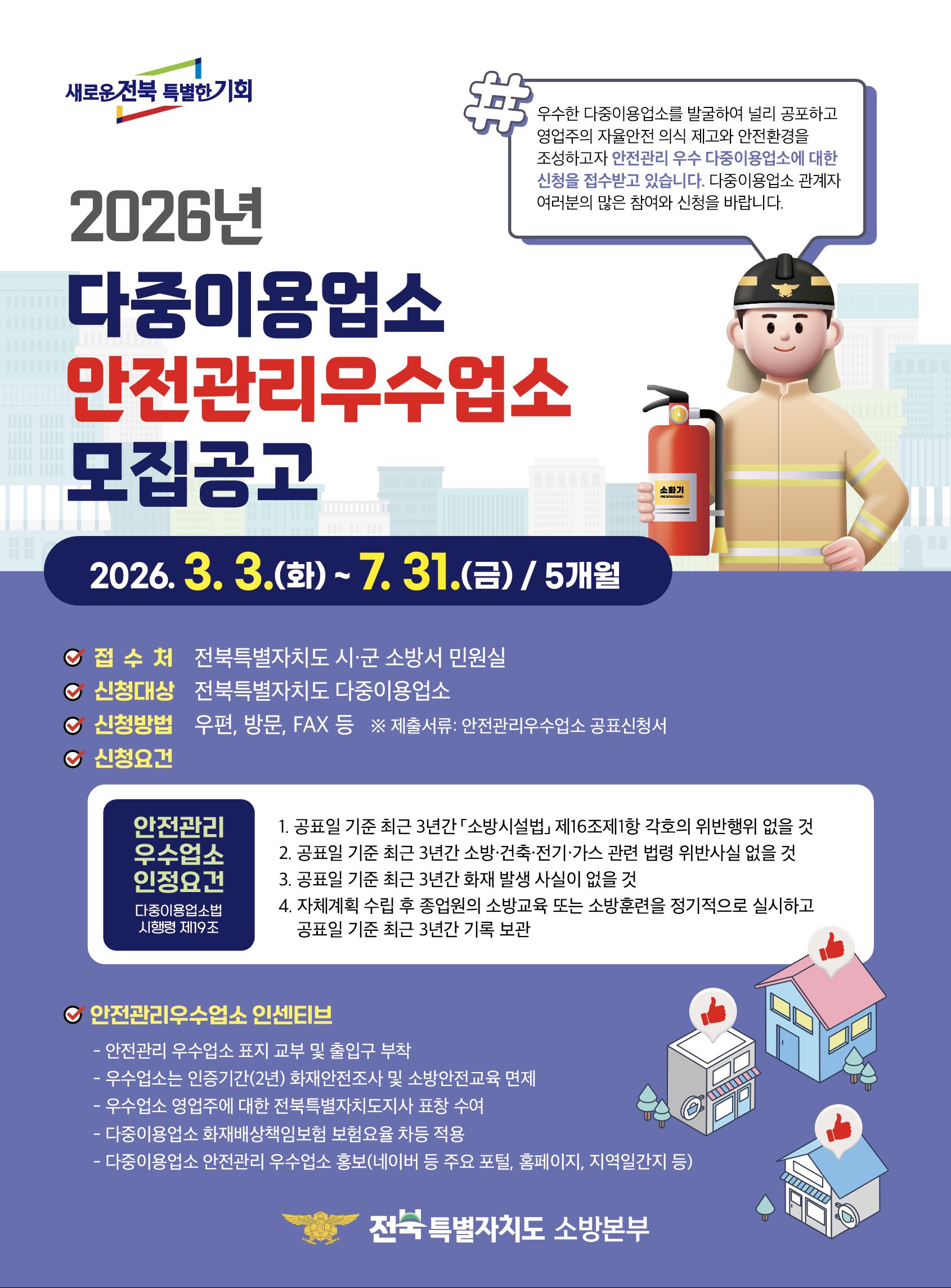 2. 진안소방서에서는 다중이용업소의 자율적인 안전관리를 유도하고, 우수한 업소를 발굴하여 혜택을 드리고자「2026년 다중이용업소 안전관리 우수업소 인정제도」를 운영하고 있습니다.